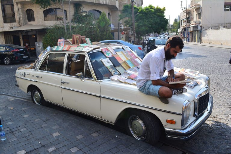 MIDDLE EAST EYE (25/9/2018) A 1974 Mercedes, wrapped in a blanket of books, stands still on Rainbow Street – one of the oldest and busiest