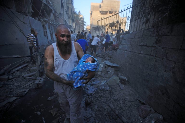 VISÃO (11.11.2023) Rodeado pelos destroços de um edifício bombardeado em Gaza, um homem coberto de pó segura uma bebé recém-nascida, resgatada dos